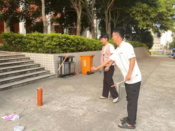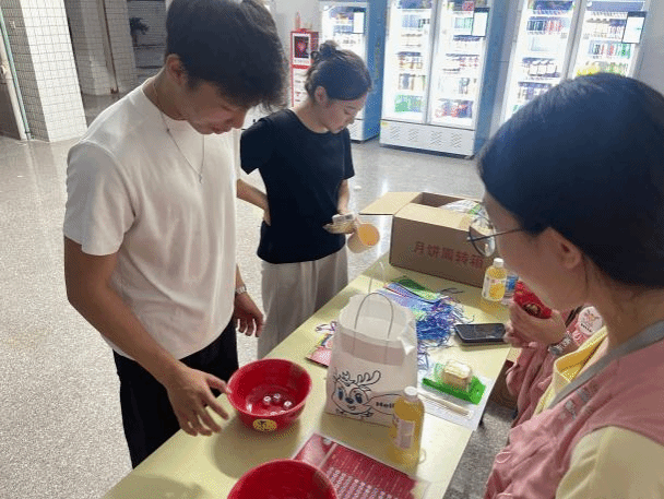 游园会现场设置了投壶、套圈、博饼、猜灯谜等特色活动。投壶区域前人头攒动,这项源自古代的传统游戏,让同学们在投掷箭矢的过程中,既体验了古人的雅致闲趣,又能为每一次“中箭”收获惊喜。套圈游戏区同样欢声笑语不断,五个圈在手中飞舞,瞄准心仪的奖品,一掷之间,满是期待与欢乐,小小的套圈仿佛圈住了双节的团圆与喜悦。最具闽南特色的博饼活动更是将现场气氛推向高潮,骰子在瓷碗里清脆作响,博的是运气,更是中秋佳节里独有的民俗韵味。猜灯谜区域则充满了智慧的碰撞。一个个谜面涵盖了中秋、国庆的文化知识与趣味谜题,同学们或独自思索,或三五成群讨论,在解谜的过程中,悄然加深了对双节文化的理解。除了丰富的游戏,学校还为每一位留校同学准备了中秋月饼,让大家在品尝香甜月饼的同时,感受学校的人文关怀。