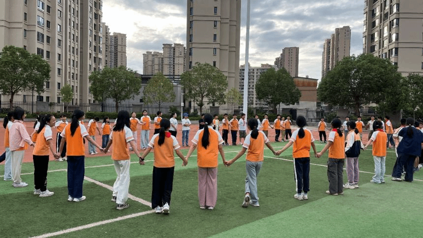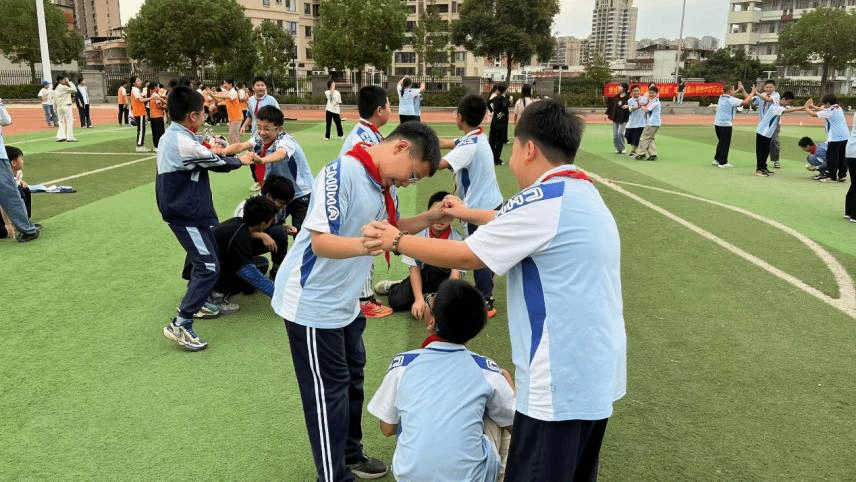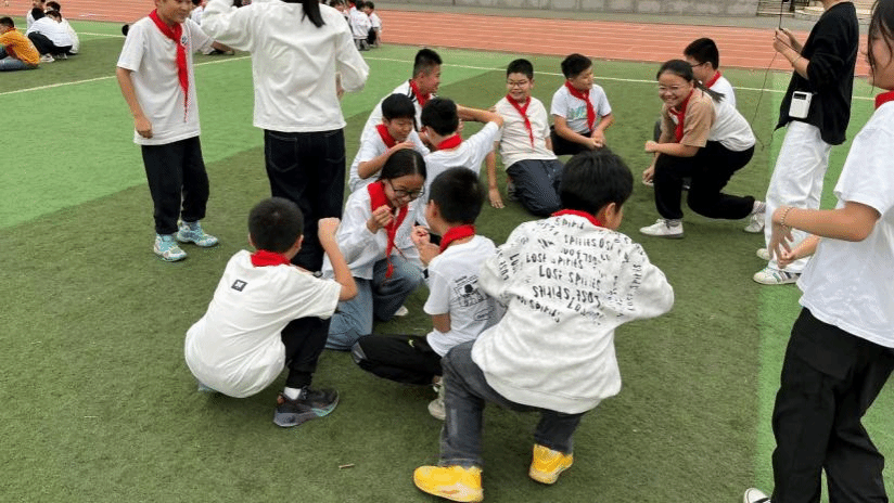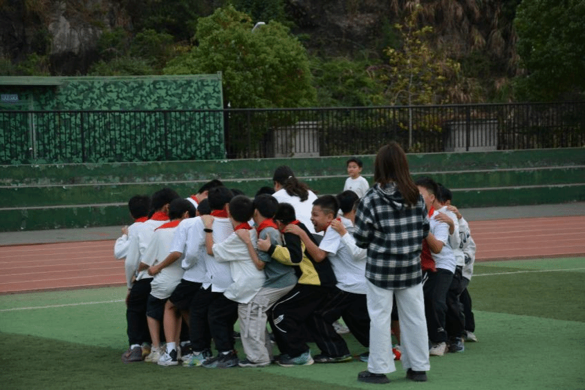 活动伊始,辅导团队通过《种太阳》纯音乐与趣味引导,迅速营造安全、亲近的心理场域,消除学生对活动的陌生感。随后,“松鼠与大树”游戏让学生在角色动态调整中,直观体验环境变化下的应变智慧,领悟“主动适应才能把握成长节奏”;“成长三部曲”以“鸡蛋→小鸡→大鸡→天鹅”的进化竞技,让学生在胜负循环中正视挫折、坚定进取信念,明白“成长从来不是一帆风顺,坚持才是破局关键”;最后,在“人椅”活动中,学生按生日排序围成协作圈,在相互支撑的坚持中,深刻感受团队信任的力量,当《明天会更好》的旋律响起时,彼此的联结也在音乐中愈发紧密。