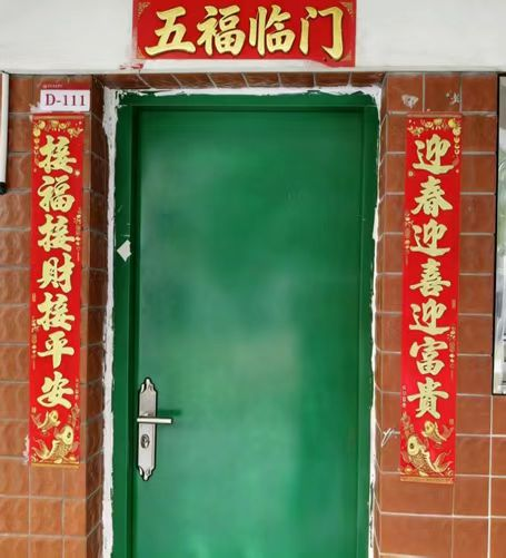 在文化特色上,宿舍中最为特别的是悬挂在每一个床位的卷轴,粘贴在门口和阳台门上的对联,这些均是由舍友亲笔提写的。这些不仅展示我们作为汉语言文学学生的书写功底和文化传承,也寄托了我们对新学期的美好祝愿。