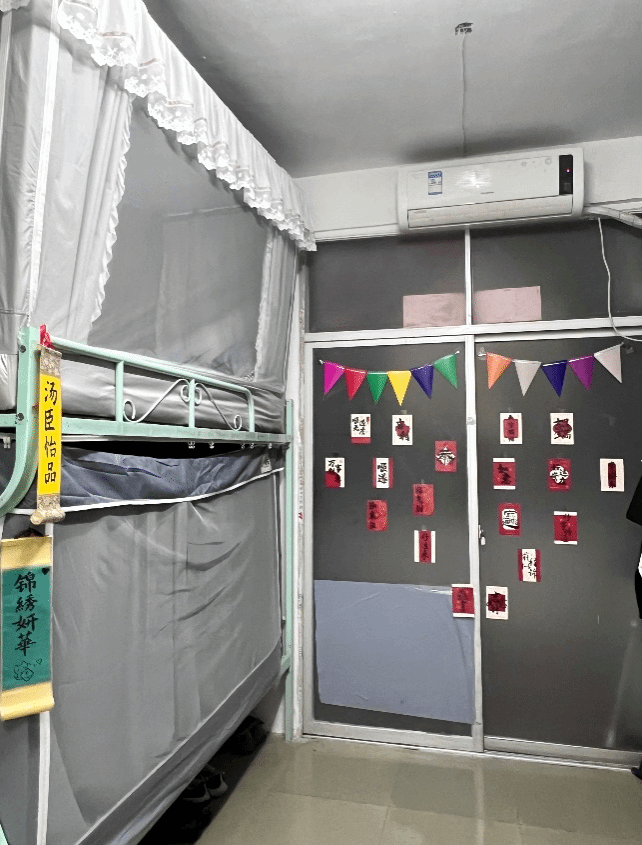 以“五福临门”为核心理念,宿舍布置融烟火气与雅趣于一体:门楣“福星高照”启祥,手绘荷莲寄寓“康宁”之愿,作息提示藏“和睦”之序;床幔围合私域,彰“安闲”之适;箱柜规整、笔墨题字,显“厚余”之致。以日常细节织就“寿、富、康、德、善”的宿舍底色,于方寸间凝萃生活意趣与人文温度。